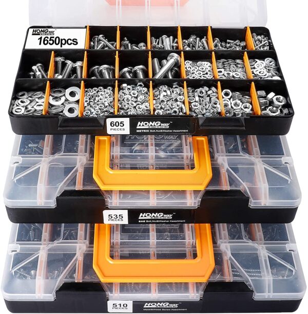 Perfect Hardware Kit: This kit contains 1650 pieces of hardware in total, including bolts, nuts, washers and screws. There are totally 64 standards: 535 pieces of SAE standard in 21 sizes, including Phillips#slot head bolts, nuts and washers; 605 pieces of metric standard in 22 sizes, including Phillips#slot bolts, nuts and washers; 510 pieces screws in 21 sizes, including wood screws and sheet metal screws.