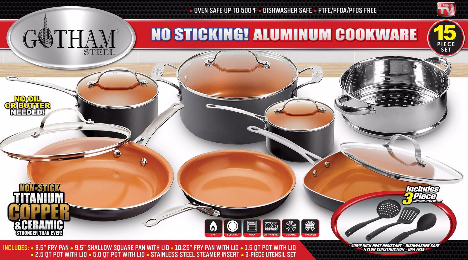 The Gotham Steel 15 piece pots and pans set include everything you need for your kitchen, including a complete suite of nonstick and lightweight fry pans, stock pots, sauce pans, steamers.