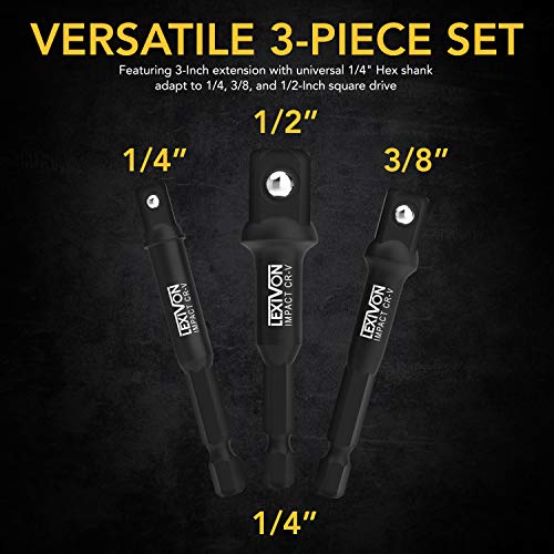 Details: LEXIVON Impact Grade Socket Adapter Set, 3″ Extension Bit With Holder | 3-Piece 1/4″, 3/8″, and 1/2″ Drive, Adapt Your Power Drill To High Torque Impact Wrench (LX-101)