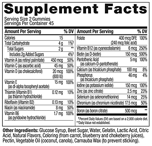 NATURALLY DELICIOUS: These chewable daily vitamins come in naturally flavored Blissful Berry with no artificial colors or flavors and are gluten free. 90 gummies per bottle (45 day supply)