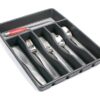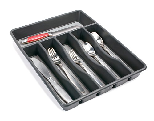 Details: Rubbermaid no slip cutlery tray, Large, Black (1994536). great silverware tray at a value price. 5 Large slots and 2 expandable trays provide storage space for all of your flatware and serving utensils. The no slip base and feet keep the utensil organizer in place as the drawer opens and closes. Made from durable plastic that is sturdy with a high class look. Easy to clean and dishwasher safe. For nearly 80 years, Rubbermaid has represented innovative, high quality products that help simplify life. Recognized as a “brand of the century” for its impact on the American way of life.