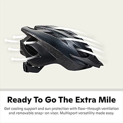 Stay safe while cycling with the Schwinn Thrasher adult bike helmet. The Thrasher is comfortable in any weather, with 21 integrated flow vents and moisture-wicking pads to keep you dry. To ensure a secure fit, the helmet includes a Dual Fit adjustable design and easy-to-adjust webbing. And riders will love the built-in visor, which provides increased shade while riding.